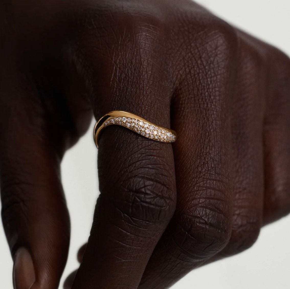 The Jasma ring features a sleek, curved gold band adorned with sparkling diamonds. Its modern design exudes elegance and sophistication, making it a timeless piece for any occasion.